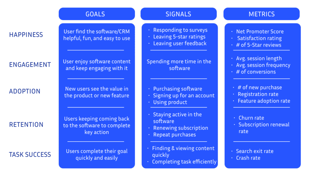 The following picture illustrates how a team would utilize this framework to define objectives, signals, and measurements for each of the five HEART categories. The Goals-Signals-Metrics structure was developed by Google as well, and it is fairly simple.